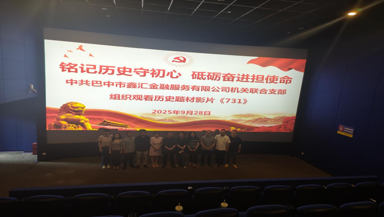 為深入推進黨史學(xué)習(xí)教育常態(tài)化長效化,深刻緬懷革命先烈,弘揚愛國主義精神,筑牢支部黨員理想信念根基,9月28日,中共巴中市鑫匯金融服務(wù)有限公司機關(guān)聯(lián)合支部組織全體黨員開展了以“銘記歷史守初心 砥礪奮進擔(dān)使命”為主題的黨日活動,集中觀看了愛國主義教育題材電影《731》。